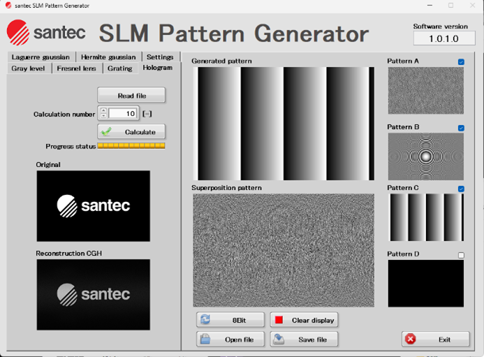 The SLM Pattern Generator can create computer-generated holograms (CGHs), generate basic optical patterns such as diffraction gratings and lenses, and superimpose multiple patterns. Created patterns can be viewed and saved on the GUI.