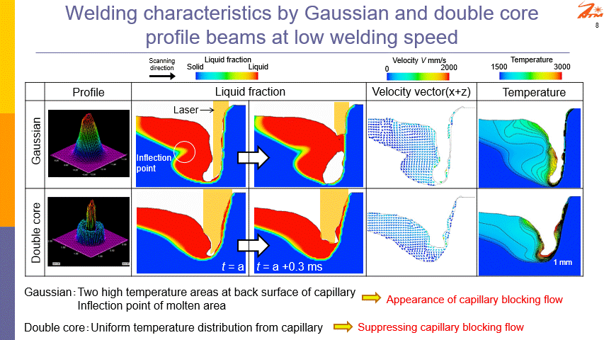 ビーム強度分布の最適化により、(1)スパッタ飛沫粒子の低減、(2)溶接内部の気泡・空隙低減、(3)溶接痕の縮小、(4)溶接スピードの向上など、さまざまな溶接品質と生産性向上が期待されております。