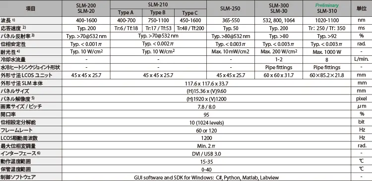 空間光変調器 仕様比較表