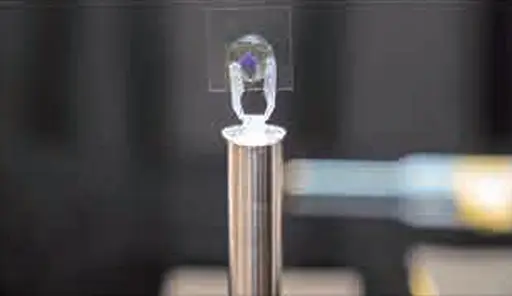ホログラフィック・コンタクトレンズディスプレイの原理確認実験。コンタクトレンズに、フォトポリマーで作製したホログラムフィルムを取り付けてある。