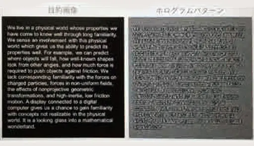 話を元に戻すと、高木研究室では現在、このSLM-200を2つの代表的な研究に役立てているそうです。1つは冒頭で触れた、コンピュータで計算して作ったホログラムのパターンをSLMに表示させ、立体像を作り出す研究です。立体像を作るために、SLMによって位相を変調しますが、振幅は変調しないため、光が減衰せず明るく表示できるという大きな特徴があります。