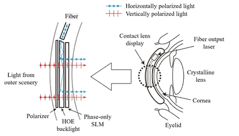 高木教授は、この技術を利用して新しい「ホログラフィック・コンタクトレンズディスプレイ」の開発を進めており、各所で注目を浴びています。コンタクトレンズにSLMを搭載して、AR 用表示デバイスにしようとしているのです。AR用デバイスというと「Microsoft HoloLens 2」*1 や「Google Glass」*2のようなヘッドマウント型ディスプレイ(HMD)をイメージするかもしれませんが、ホログラフィック・コンタクトレンズディスプレイは全く構造が異なります。( 写真左)